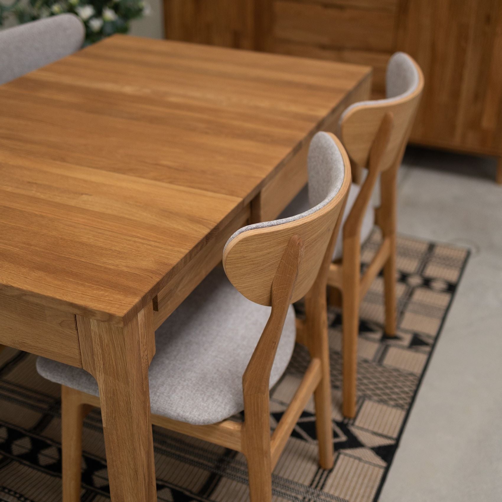 De stoel is gemaakt van massief natuurlijk eikenhout. Maxwell stoel zich door zijn zachte en knusse uiterlijk, dat de authentieke schoonheid van het hout benadrukt. De elegante en rustgevende bekleding van lichtgrijze stof vormt een delicaat en elegant contrast met het hout. De afgeronde lijnen van de stoel voegen een dimensie van comfort en gezelligheid toe.