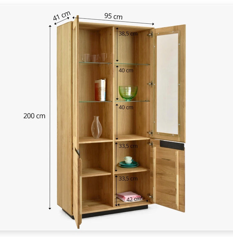 De vitrine "Bremen" gemaakt van massief eikenhout, met een afmeting van 95 x 41 x 200 cm, biedt een elegant en functioneel ontwerp met twee deuren die gemakkelijke en praktische toegang tot opslagruimte mogelijk maken. Deze vitrinekast is gemaakt van massief hout en valt op door zijn duurzaamheid en de natuurlijke afwerking die de schoonheid van het eikenhout benadrukt. Ideaal voor wie op zoek is naar een duurzaam en tijdloos meubelstuk dat perfect combineert met moderne of Scandinavische omgevingen. Perfect voor het tentoonstellen van voorwerpen en het handhaven van de orde in elke woon- of eetkamer.